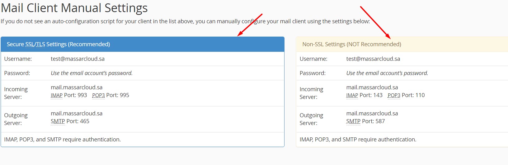 As you will see we provide 2 type of connection , SSL Secure connection which we recommend to use and the other one is NON-SSL which we don't recommend you to use but some old programs may not support the secure connection then you can use non-ssl configurations.